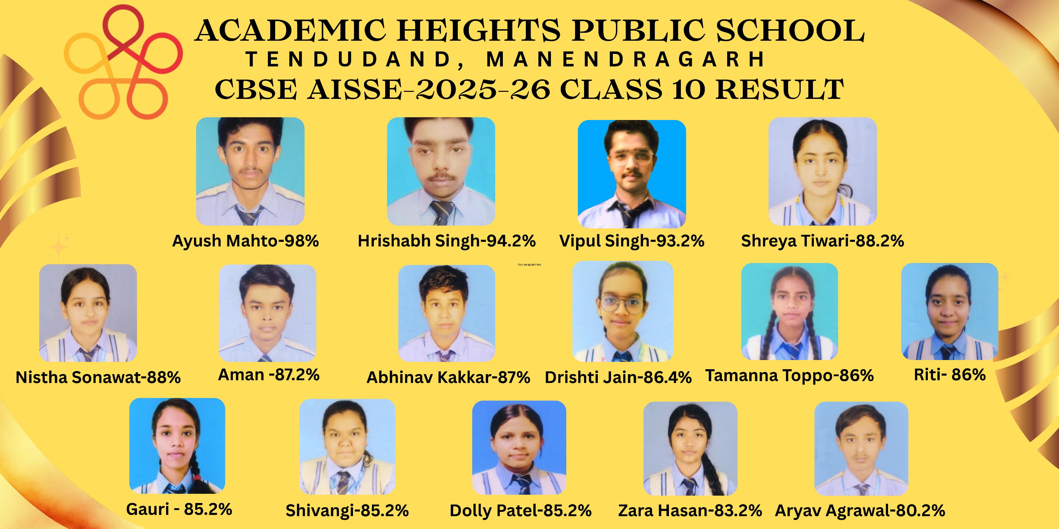 मनेन्द्रगढ़। एमसीबी । एकेडेमिक हाइट्स पब्लिक स्कूल का सी. बी. एस. ई. बोर्ड के कक्षा दसवीं का परिणाम शत प्रतिशत रहा । आयुष कुमार महतो ने 98% अंक प्राप्त कर मनेन्द्रगढ़ में प्रथम स्थान पर रहे 94.2% अंकों के साथ रिषभ सिंह तृतीय स्थान एवं तृतीय स्थान पर विपुल सिंह ने 93.2 प्रतिशत अंक प्राप्त किए। आयुष कुमार महतो ने स्टेंडर्ड गणित विषय में सर्वाधिक 99 अंक प्राप्त किया। 47 विद्यार्थी प्रथम श्रेणी में उत्तीर्ण हुए। 15 विद्यार्थियों ने 80 प्रतिशत से ज्यादा अंक प्राप्त किया। इन विद्यार्थियों ने कुछ सपने सँजोए हुए हैं। कोईं इन्जीनीयर तो कोई डॉक्टर या प्रशासनिक सेवा में जाकर राष्ट्र की सेवा करना चाहते हैं। सभी विद्यार्थी अपनी इस सफलता के पीछे स्वयं की कड़ी मेहनत, विद्यालय के शिक्षकों का कुशल मार्ग दर्शन तथा अपने माता-पिता के सपोर्ट को वजह माना। एकेडेमिक हाइट्स पब्लिक स्कूल सभी विद्यार्थियों को गुणवत्तापूर्ण शिक्षा के साथ-साथ सर्वांगीण विकास पर भी भरपूर जोर देता है। विद्यालय के निर्देशक, प्राचार्य एवं शिक्षकों ने सभी विद्यार्थियों को शुभकामनाएँ दी तथा इसी तरह भविष्य में भी और बुलंदियों को छुने की प्रेरणा दी।