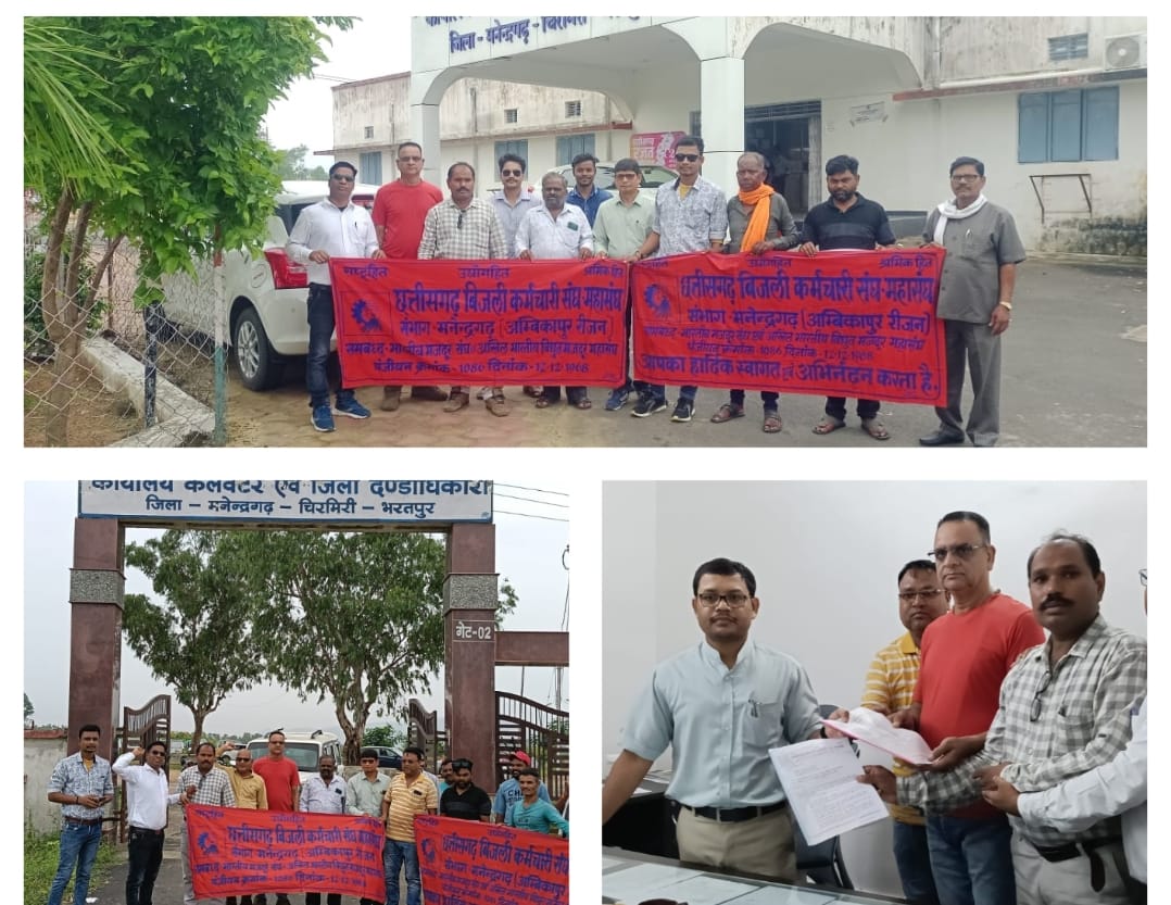 मनेंद्रगढ़। एमसीबी। मिथिलेश दुबे जिला संयोजक /प्रभारी छत्तीसगढ़ बिजली कर्मचारी संघ-महासंघ ने बताया कि मुख्यमंत्री छत्तीसगढ़ शासन और केंद्रीय ऊर्जा मंत्री भारत सरकार मनोहर लाल खट्टर को कलेक्टर जिला मनैनद्रगढ़ चिरमिरी भरतपुर के द्वारा ज्ञापन दिया गया है, जिसमें छत्तीसगढ़ स्टेट पॉवर कंपनी में व्याप्त विभिन्न श्रमिक समस्याओं का निराकरण किये जाने की मांग की गई है।