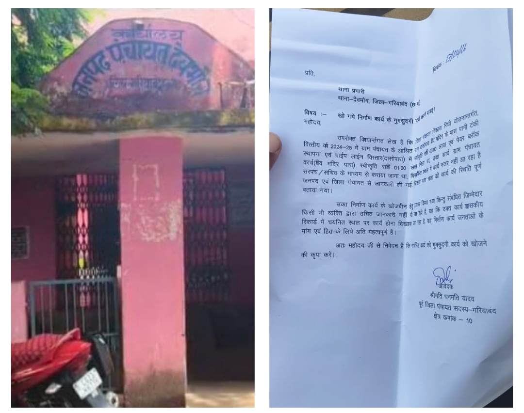 देवभोग। गरियाबंद । सरकारी योजना का बंदरबाट कर कागजों में ही ग्राम पंचायत चिचिया के सरपंच और सचिव के द्वारा निर्माण कर डाली, धरातल में निर्माण कार्य का मुआयना करने जब पूर्व जिला पंचायत सदस्य धनमती यादव पहुंची तो देखा की जिस चयनित स्थल में काम होना था वहां अभी भी निर्माण नहीं हुआ। जिसे लेकर पूर्व जिला पंचायत सदस्य धनमती यादव ने स्वीकृत कार्य कि गुमसुदगी रिपोर्ट दर्ज कराने देवभोग थाना पहुंची।